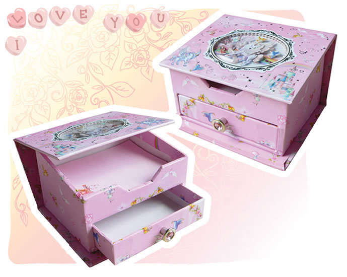 Truhlička pro dívky. Vyrobená z odolného a pevného papíru s hladkou povrchovou úpravou. Truhla má jemný dívčí design v růžové barvě. Ze všech stran je ozdobená pohádkovým motivem třpitkami a stříbrným lemováním. Na víku je reliéfní okénko s bílým Pegasem. Po otevření horního víka najdete...
