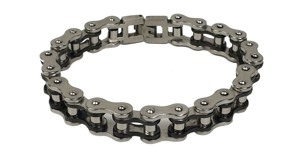 Imitace bike řetězuVyrobeno z chirurgické oceli a tvrdého kaučuku(vydrží celodenní nošení a koupání včetně slané vody bez povrchových změn) Délka náramku 21cm. prečítať celé