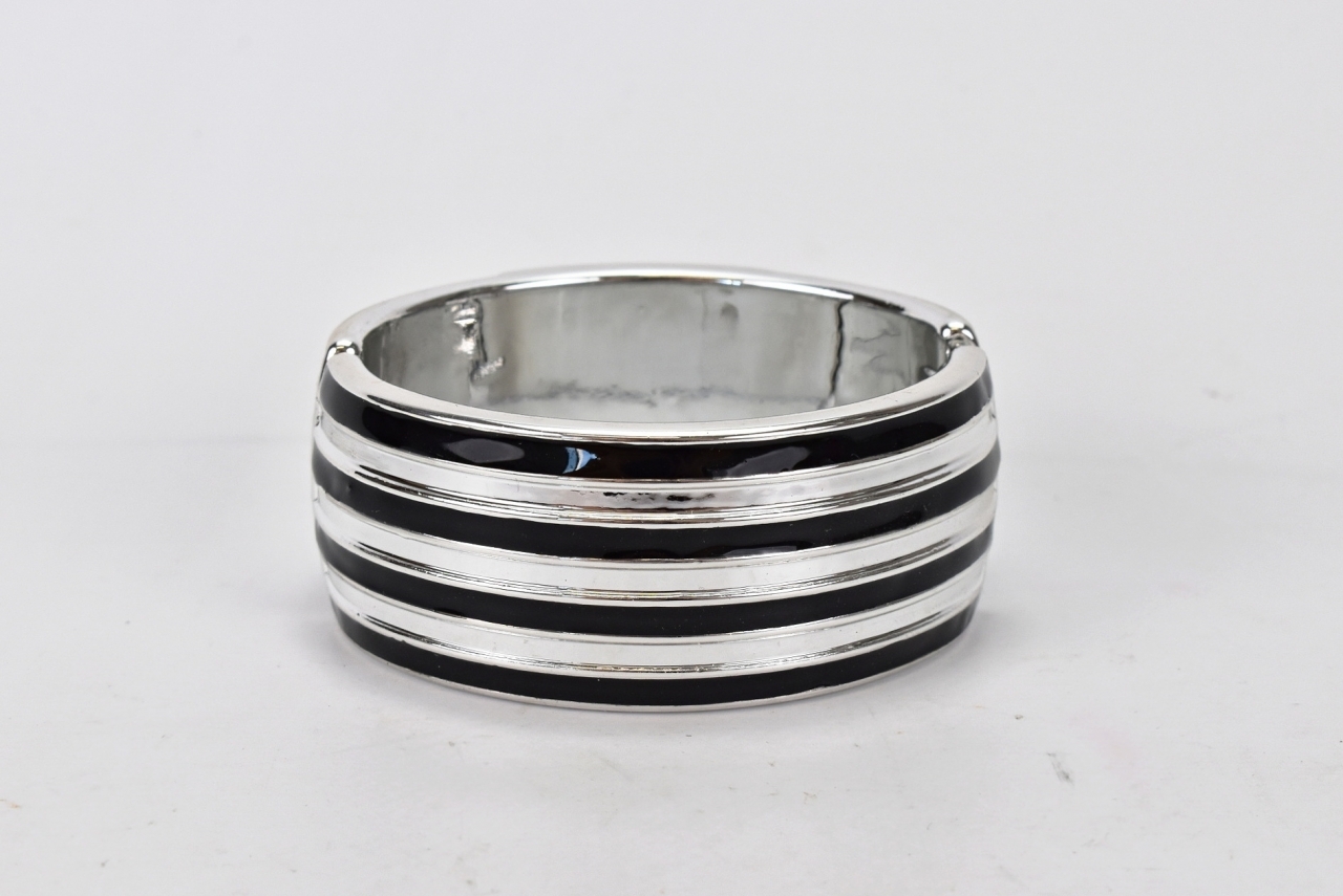 Moderní dámský náramek na ruku ve stříbrné barvě v kombinaci s černou. Náramek má dva designy viz fotogaleri.Materiál: bižuterní kovRozměry:průměr 7 cm prečítať celé