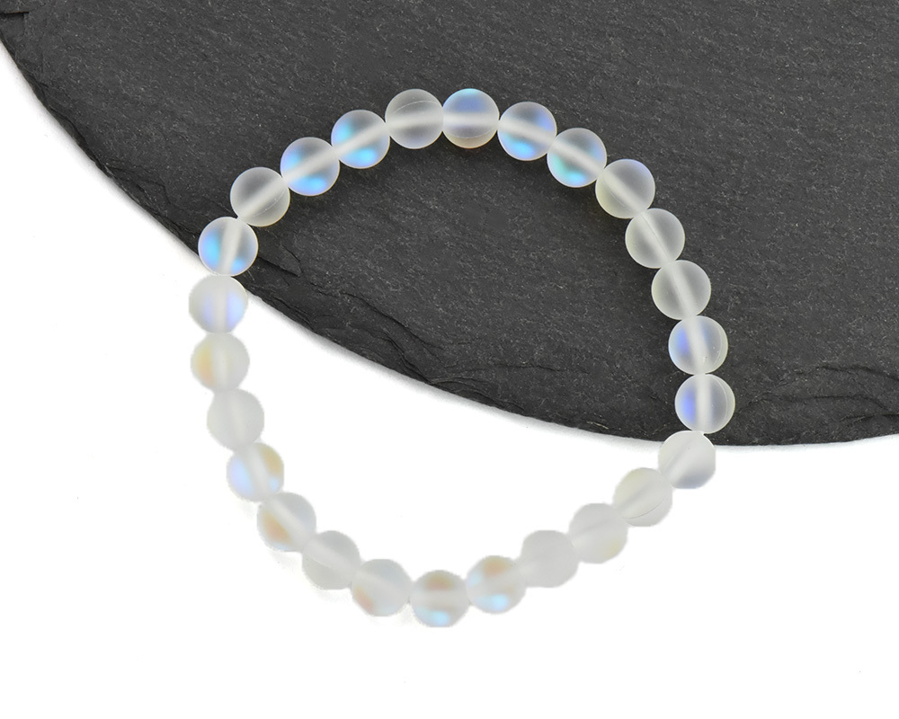 Opalit je syntetický kámen. Jde o uměle vyrobené opálové sklo, které svými světelnými odlesky napodobuje přírodní opálové hmoty (gely). Svým vzhledem připomíná měsíční kámen. Charakterizují ho mléčné a krásné barevné odstíny. Mezi nejoblíbenější patří bílá, růžová, modrá, tyrkysová, šedá a fialová.Dětský náramek s kuličkou 6 mm. Délka náramku je cca 16 cm.