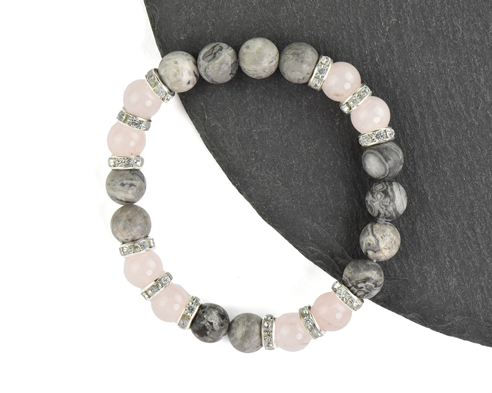 Náramek z růžových a šedých korálků doplněný o korálky s kamínky.Velikost: univerzální Průměr jedné kuličky: 8 mm Materiál: kov, plast, kámen prečítať celé