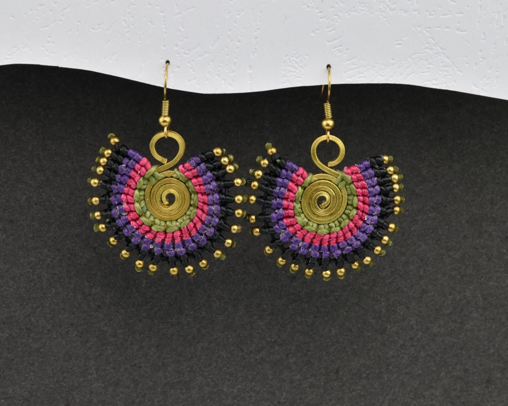 Ručně vyrobené drhané náušnice z voskovaného provázku, na kovovém základu, dozdobené drobnými preličkami.Každý pár těchto naušnic je jedinečný originál.Materiál: kov, voskovaná bavlnkaRozměry: 3,5 x 4 cm prečítať celé
