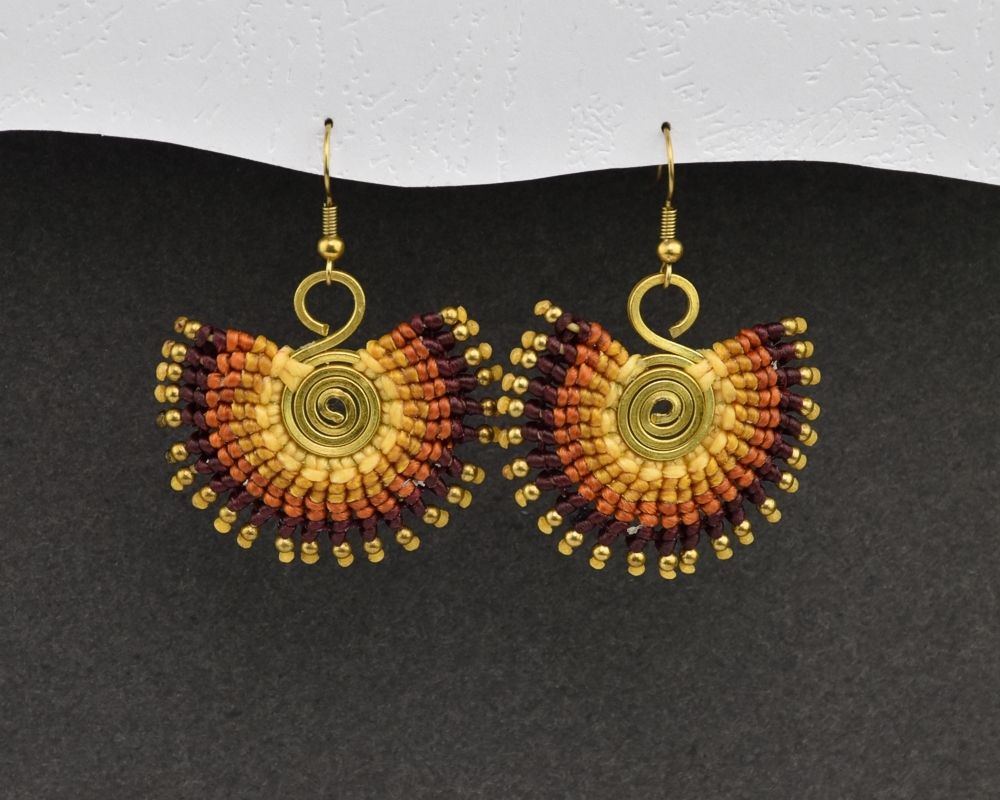 Ručně vyrobené drhané náušnice z voskovaného provázku, na kovovém základu, dozdobené drobnými preličkami.Každý pár těchto naušnic je jedinečný originál.Materiál: kov, voskovaná bavlnkaRozměry: 3,5 x 4 cm prečítať celé
