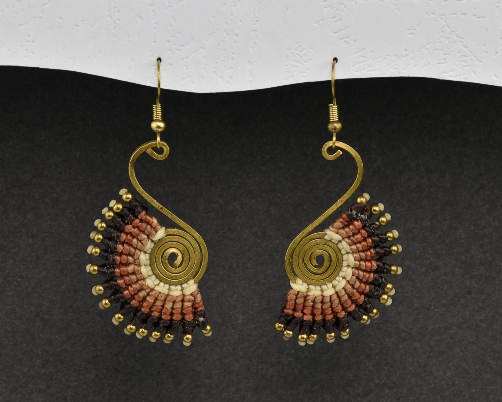 Ručně vyrobené drhané náušnice z voskovaného provázku, na kovovém základu, dozdobené drobnými preličkami.Každý pár těchto naušnic je jedinečný originál.Materiál: kov, voskovaná bavlnkaRozměry: 4,5 x 3,5 cm prečítať celé
