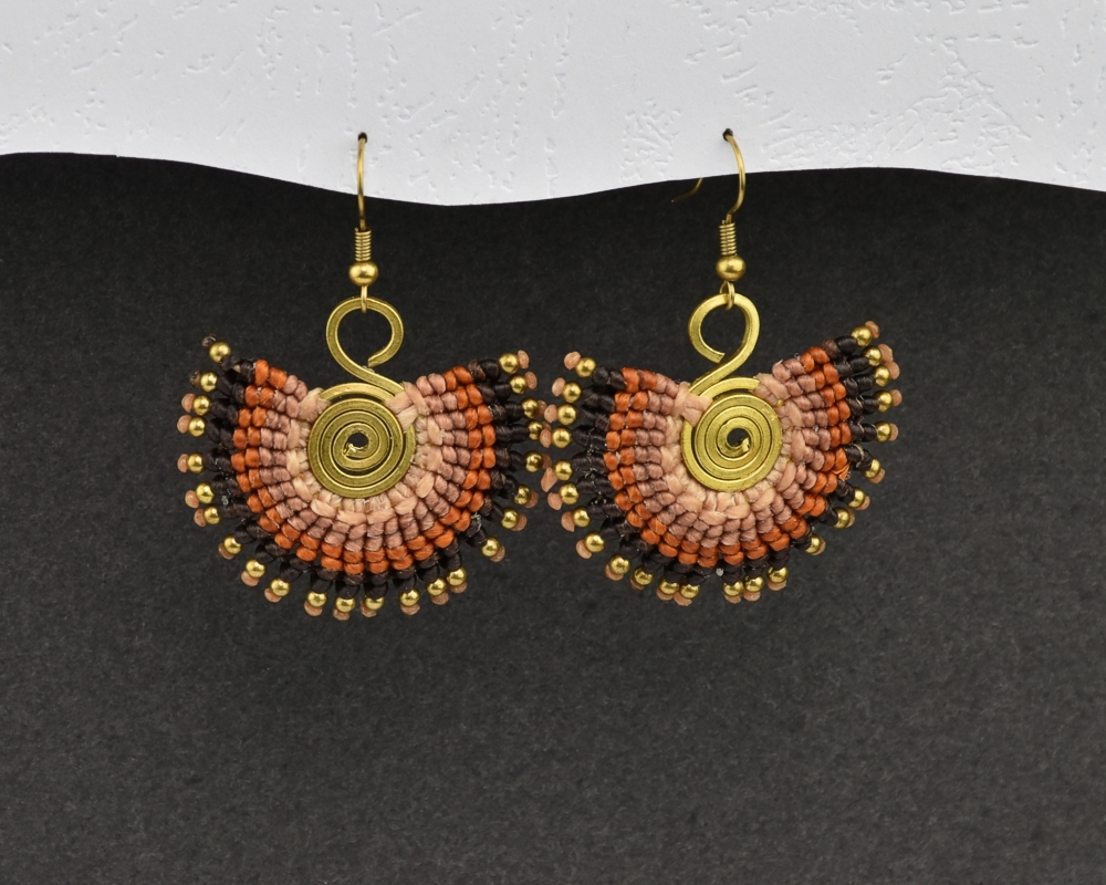 Ručně vyrobené drhané náušnice z voskovaného provázku, na kovovém základu, dozdobené drobnými preličkami.Každý pár těchto naušnic je jedinečný originál.Materiál: kov, voskovaná bavlnkaRozměry: 3,5 x 4 cm prečítať celé