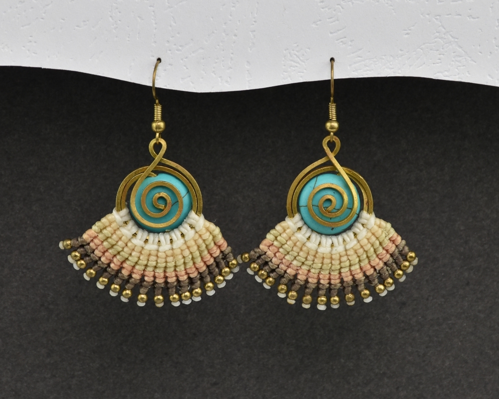 Ručně vyrobené drhané náušnice z voskovaného provázku, na kovovém základu, dozdobené drobnými preličkami a modrým Tyrkenitem.Každý pár těchto naušnic je jedinečný originál.Materiál: kov, voskovaná bavlnka, minerálRozměry: 4 x 4 cm prečítať celé
