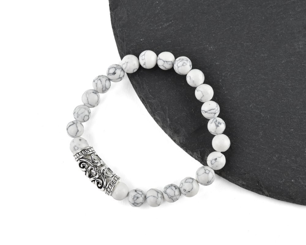 Náramek z bílých korálků doplněný o korálek s orientálním vzoremVelikost: univerzální Průměr jedné kuličky: 8 mm Materiál: plast, kov prečítať celé