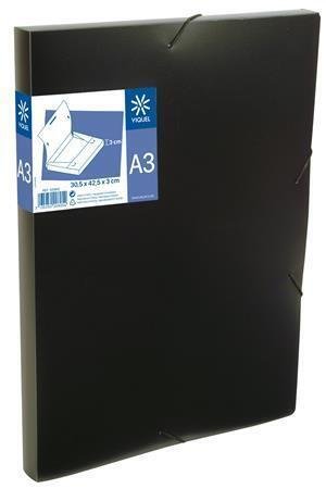 Desky s gumičkou vhodné na uchovávání dokumentů ve formátu A3.Vlastnosti: pružný materiál; uzavíratelné gumičkou přes rohy; se 3 chlopněmi;Formát: A3Barva: černáMateriál: polypropylenRozměry: 42,5x30,5x3 cm prečítať celé