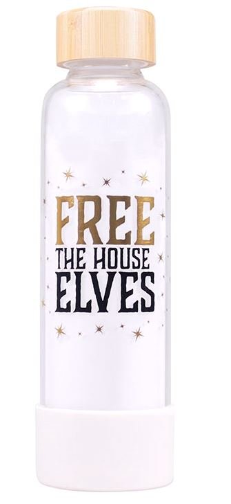Skleněná láhev na pití s nápisem FREE THE HOUSE ELVES.