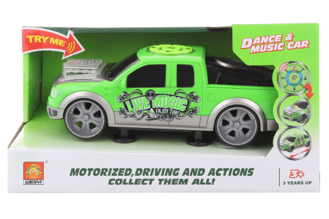 Plastové sportovní auto na baterie. Auto po zmáčknutí tlačítka tančí, vydává zvuky, svítí, jezdí dopředu a dozadu. Napájení na 3 AA baterie (jsou součástí). Rozměry auta cca 25 x 9 x 10 cm. Rozměry balení cca 30,5 x 16,5 x 14 cm. Věk 3+ prečítať celé