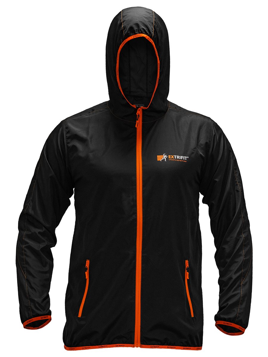 Extrémně lehká bunda firmy Extrifit s potiskem a děrováním, s kapucí a dvěma kapsami na zip vpředu. Černá barva s oranžovými aplikacemi - kontrastní pružné obruby kapuce, rukávů a spodního lemu (s černým nápisem Extrifit), zip bundy i kapes. Poutko na pověšení, prodlužovače jezdců zipů oranžové s černým nápisem Extrifit.