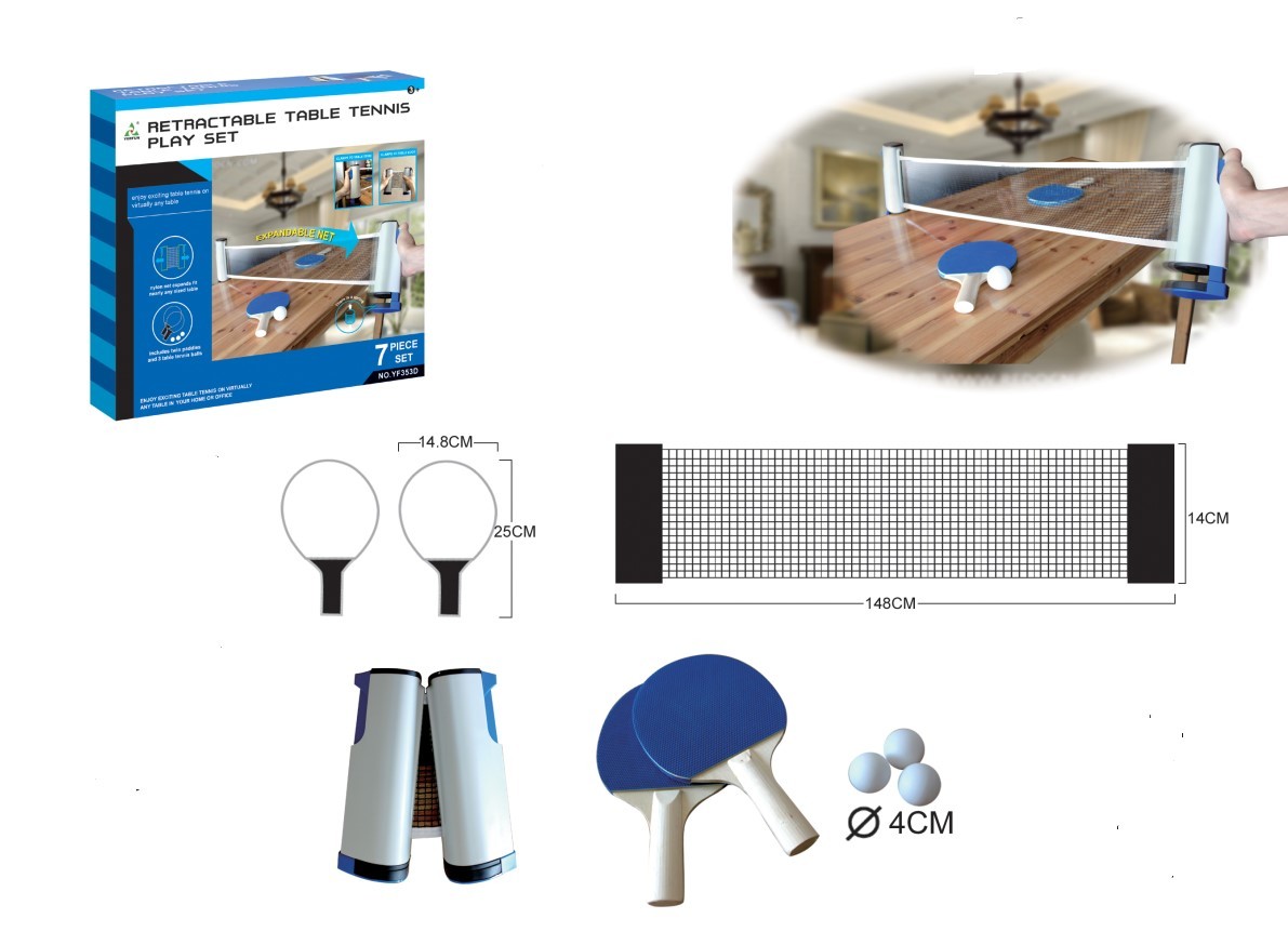 Sada síťky, pálek a míčku na stolní tenis. Síťka je stahovací a roztahovací. Max. délka 148 cm a výška 14 cm. Sada obsahuje 2 pálky a 3 míčky. prečítať celé