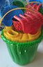 Komplet zawiera: Wiaderko, sitko, grabki, łopatka oraz 3 foremki. Mix kolorów, towar wysyłany losowo.