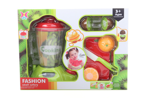 Plastový mixér s ovocem, prkénkém a nožíkem na krájení. Ovoce je spojeno suchým zipem a lze jej krájet a znovu spojovat. Mixér má manuální otáčení a horní víčko na baterie svítí a vydává zvuky. Napájení 2x AA baterie (nejsou součástí). Rozměr mixéru cca 19,5 cm. Rozměry balení cca 32 x 24 x 11,5 cm. Věk 3+