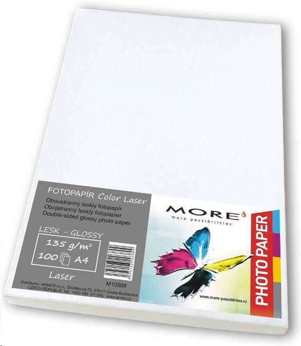 Typ technologie fotopaperUrceno pro Oboustranný lesklý papír pro barevné laserové tiskárny MORE Hlazený Color Laser papír; 135g/m2Barva Color LaserKapacita 100Pocet stran 100 prečítať celé