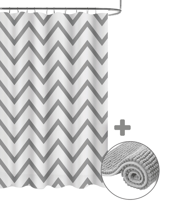 Koupelnový závěs: součástí balení kroužky, materiál: 100% PoliVinylChlorid (PVC),rozměry: 180x200cm.Předložka CHENILL:barva: šedá,materiál: žinylka,protismykový latexový nátěr z rubu,lze prát v pračce na 30°C,rozměr: 40x60 cm. prečítať celé