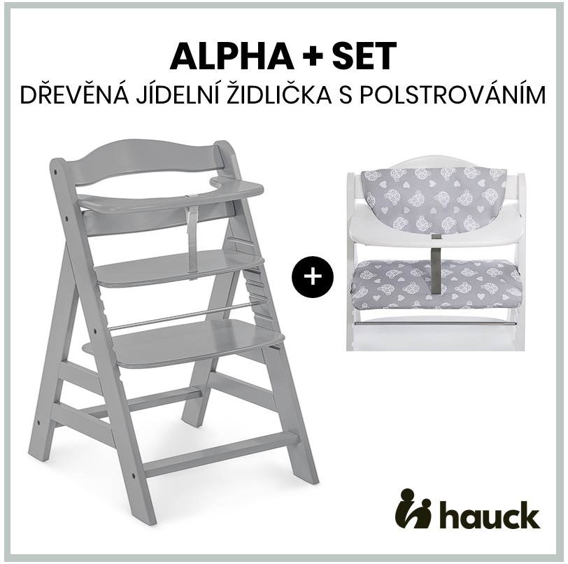 Hauck Alpha+ set 2v1 dřevěná židle, grey + polstrování Teddy grey