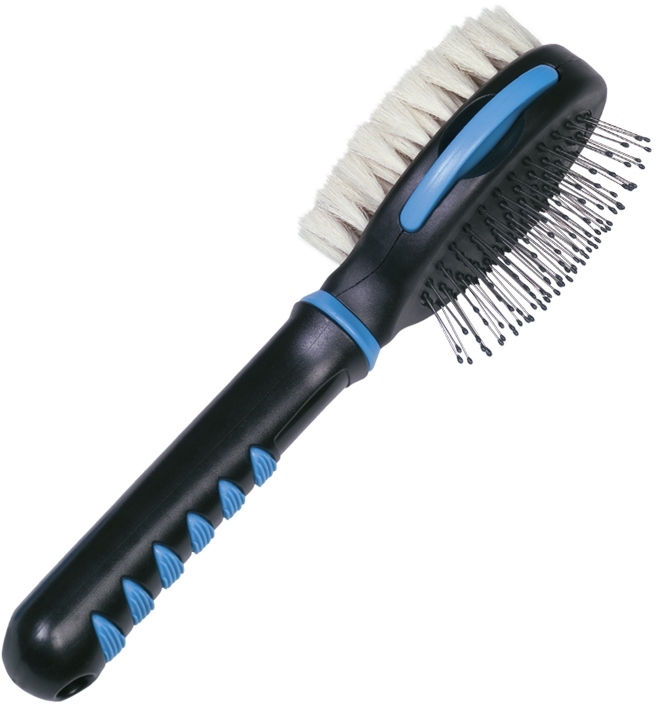 Multifunkční oboustranný kartáč Nobby z kolekce Comfort Line. Kartáč z jedné strany s ocelovými štětinkami s plastovou ochranou a z druhé strany se štětinami z přírodní kozí srsti. Vhodné pro psy, kočky, štěňata a koťata. Ocelový kartáč (štětiny s plastovou ochranou) masírují pokožku a podporují...