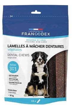 Doplňkové krmivo pro velké psy o hmotnosti nad 30kg.Vlastnosti: Žvýkací plátky jsou velmi lehce stravitelné. Jejich tvar a textura usnadňuje žvýkání a zlepšuje čištění zubů. Mechanické abrazivní působení pomáhá odstranit povlak na zubech a omezuje tvorbu zubního kamene. Podporuje svěží...