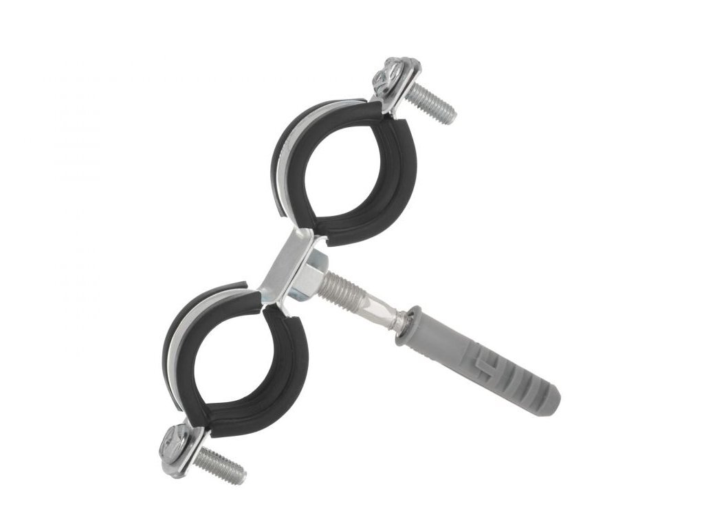 Dvojitá objímka se dvěma šrouby je vyrobená z pozinkované oceli s gumovou vložkou a upevňovací maticí M8. Díky dvěma šroubům lze sevření objímky přizpůsobit vnějšímu průměru potrubí.