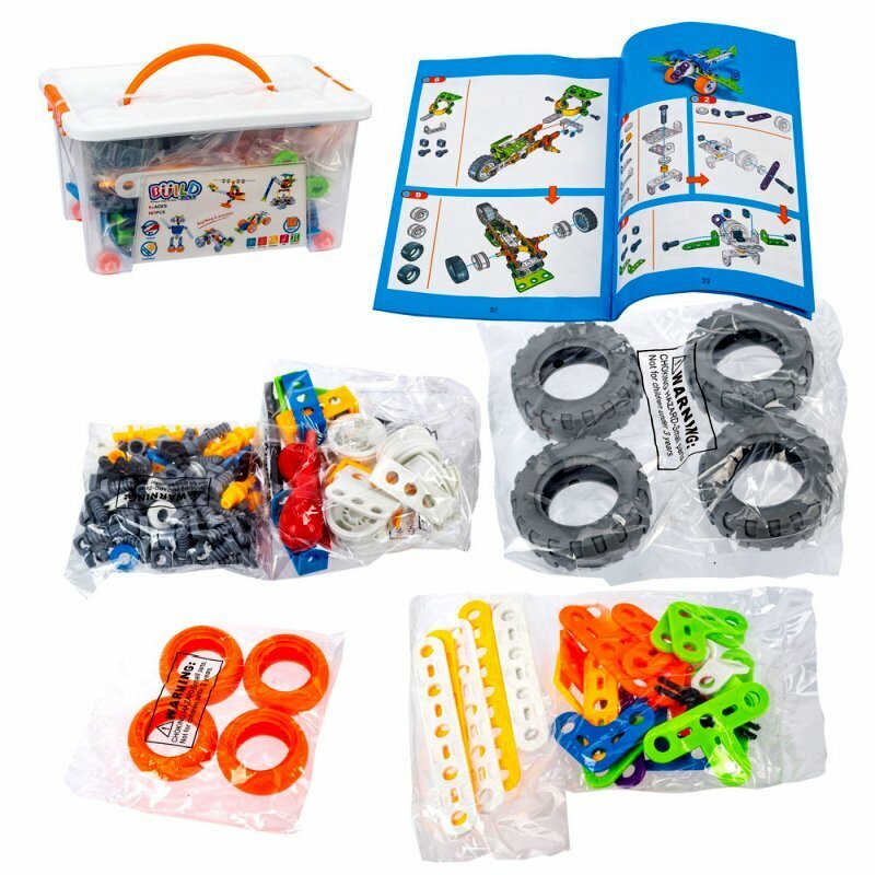 Plastikowe klocki konstrukcyjne (167el.), z których budujemy pojazdy i maszyny różnego rodzaju (10 różnych modeli). Dostępne w opakowaniu elementy odznaczają się różnorodnymi kolorami(zielony, szary, pomarańczowy, żółty). Wszystko zostało zapakowane w pudełko na małych kółeczkach z rączką. Dzięki temu cały zestaw przeniesiemy w łatwy sposób w dowolne miejsce.Wymiary opakowania: 14x19x26cmWiek: 3+