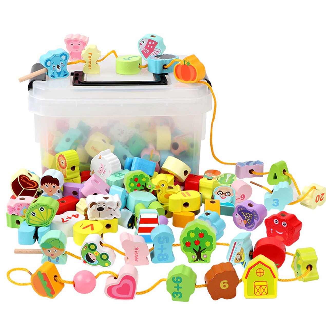 Pestrobarevný herní didaktický set plný dřevěných navlékacích korálků s obrázky a čísly pro prečítať celé