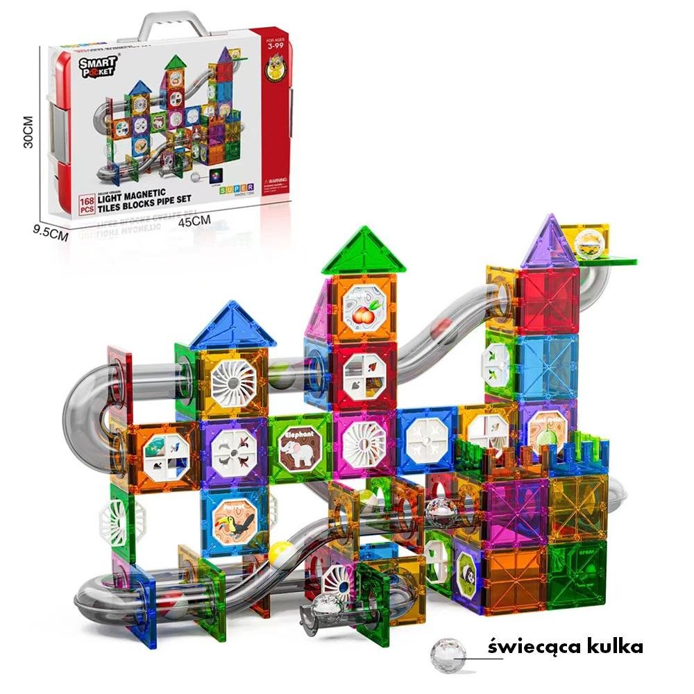Duży zestaw świecących klocków magnetycznych. Zawiera 168 elementów. Świecąca kulka. Wymagane baterie: 1xGR1220 (dołączone). Wymiary opakowania: 45 x 9,5 x 30 cm prečítať celé