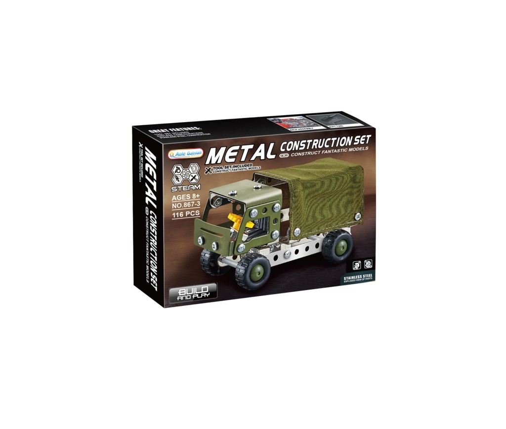 Postavit jedinečné vojenské auto ze 116 dílků je náročná, ale zároveň nesmírně uspokojující úloha. Sada obsahuje kombinaci kovových dílů a plastových doplňků, které se spojují pomocí šroubků a matiček. Tento sofistikovaný systém stavby je navržen tak, aby stavění bylo jednoduché, zábavné a zároveň výzvou.