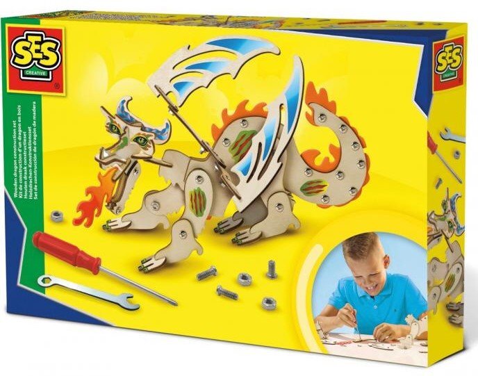 Sestavte si dřevěného draka. Díky této konstrukční sadě SES Creative si můžete vytvořit draka ze dřeva. Postupujte pečlivě podle pokynů v návodu. Použijte matičky, šrouby, dřevěné a pěnové doplňky. Nakonec ozdobte svého draka samolepkami. Sada obsahuje: