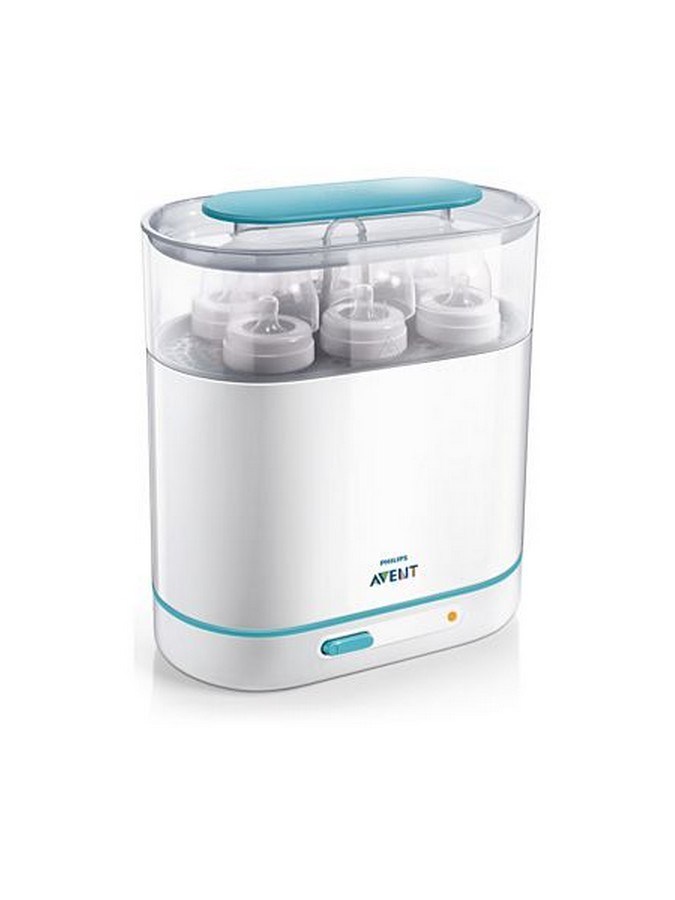 Elektrický parní sterilizátor 3v1 Avent. Charakteristika:- nastavitelná velikost - vhodný pro láhve se širokým i úzkým hrdlem- vhodný pro různé druhy odsávaček a příslušenství- lze používat 3 způsoby – sterilizace malých předmětů, středně velkých předmětů či šesti 330 ml lahví za pomoci 100 ml...