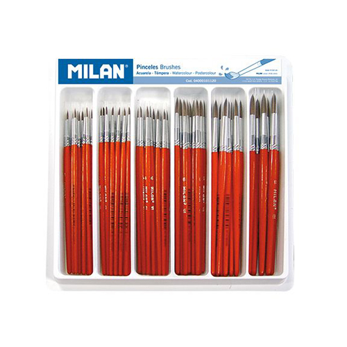 Kulaté štětce s krátkou dřevěnou rukojetí. Hnědá lakovaná povrchová úprava a hliníková dutinka. Složení: 70% přírodní kozí vlasy + 30% syntetické. Vhodné pro akvarely, techniky na bázi vody a barvy na plakáty. Obsahuje: 24 štětců číslo 1, 2, 4 a 6 a 12 štětců číslo 8 a 10.