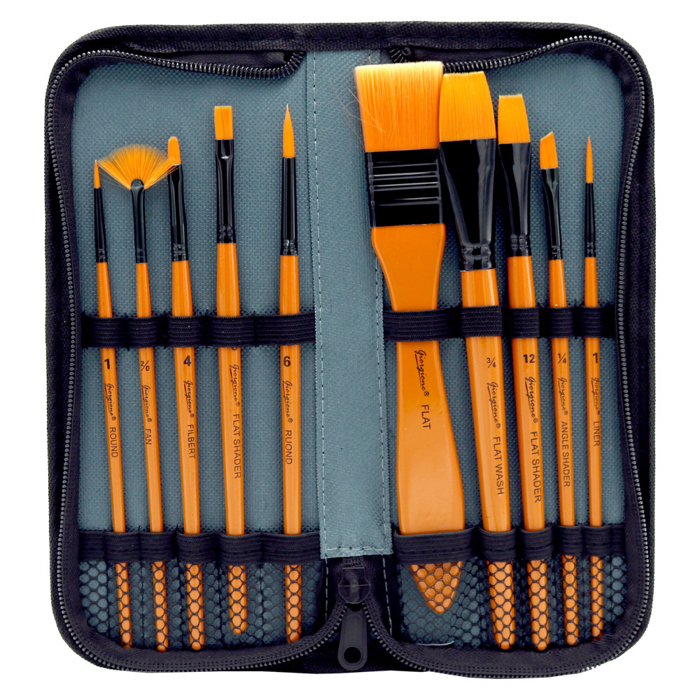 Sada 10 ks štětců pro výtvarné umělce v praktickém obalu na zip které chrání štětce před poškozením a je kompaktní na přenášení.