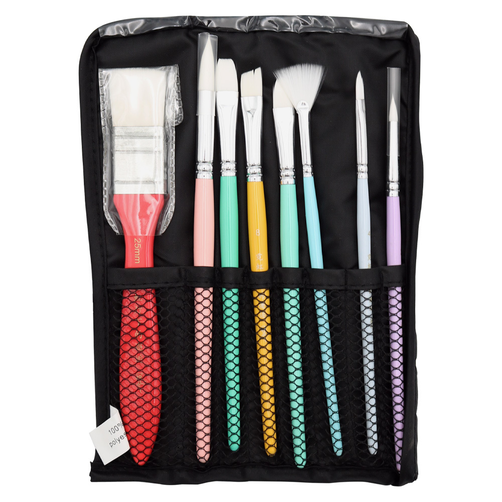 Sada štětců pro výtvarné umělce v praktickém svinovacím obalu se šňůrkou a plastové tubě s víčkem a poutkem.štětce ploché č.: 1/4, 2, 6, 8, 10, 25 mm (rovný, zkosený tvar štětin)štětce kulaté č.: 4,12materiál: plastová, barevná násada, bílý nylonový vlas, obal z polyesteru