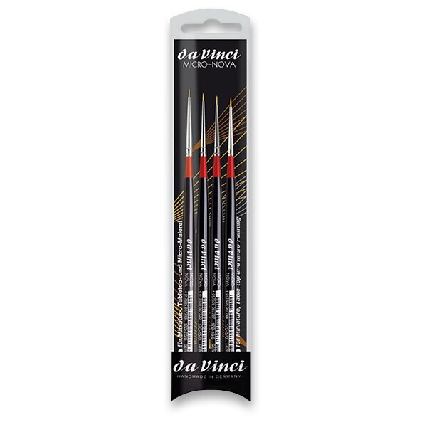 Sada 4 kusů syntetických štětců da Vinci Nova Micro osvědčené kvality, od německého výrobce s dlouholetou tradicí. Speciální řada štětců nejmenší velikosti pro zachycení nejjemnějších detailů. Ergonomicky tvarovaná krátká rukojeť pro dokonalý úchop s ploškami proti kutálení. Ideální pro malování miniatur, modeláře a obecně pro zachycení detailů.