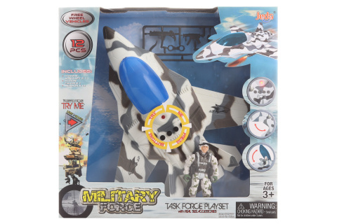 Vojenská stíhačka na baterie. Stíhačka vydává zvuky a svítí. Napájení na 2 AG13 baterie (jsou součástí). Součástí balení je také voják a zbraně. Rozměry stíhačky cca 28 x 24 cm. Rozměry balení cca 30 x 29 x 6,5 cm. Věk 3+ prečítať celé