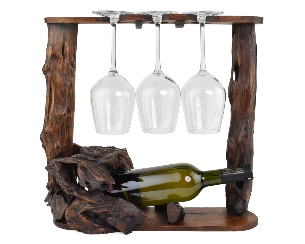 Přírodně vypadající stojan na tři sklenice a láhev vína z teakového dřeva. Vhodný doplněk především do interiéru s dřevěnými prvky. Boční tyče umožňují jednoduché uchopení a přenášení.Parametry: Váha: cca 1,8 kg Rozměry: 38 x 38 cmHloubka: 15 cmRozměr uložiště pro láhev: 10 x 10 cm