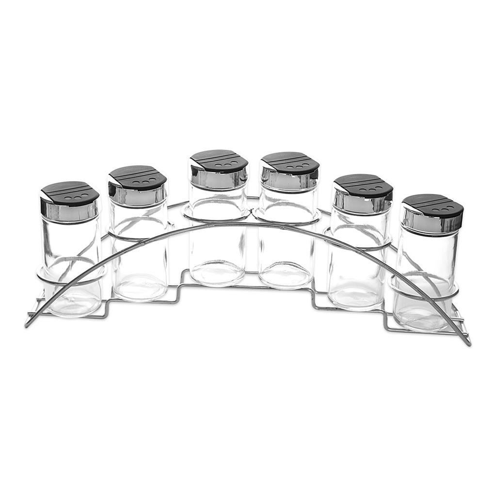 Drátěný stojan se 6ti kořenkami Vám umožní mít Vaše oblíbené koření vždy po ruce. Můžete ho umístit na volnou plochu kuchyňské linky všude tam, kde je právě zapotřebí. Přehledně uloží základní druhy koření. Materiál: stojan – chrom, skleněné kořenky jsou opatřeny plastovými víčky PP s otvíracími sypátky PP. Rozměry: stojan 33x6x14 cm, kořenka objem 0,1 l, pr. 4 cm, v. 10 cm.