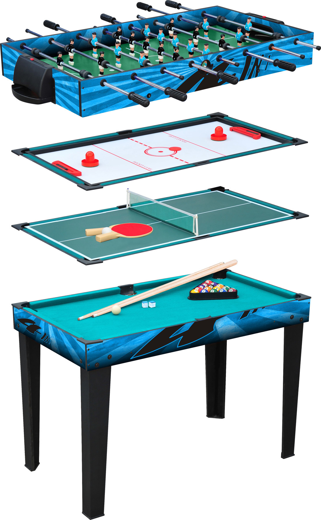 Všestranný hrací stůl, který přináší něco nového a patří do každé herny.Multifunkční herní stůl se čtyřmi hrami! Díky zaměnitelným herním povrchům se dá snadno přeměnit z kulečníkového stolu na stolní tenis, stolní hokej nebo stolní fotbal. Okraje stolu jsou vyrobeny ze dřeva. Saučástí jsou pálky...