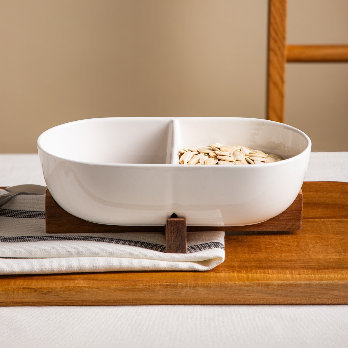 Nowoczesny design z dwoma praktycznymi przegródkamiWykonany z wysokiej jakości porcelanyElegancka forma na drewnianej podstawieIdealny do serwowania przekąsek, przystawek i dodatkówPółmisek z przegródkami 25,5 × 14 cmMinimalistyczny, a zarazem elegancki półmisek MOOKA to doskonały wybór dla...