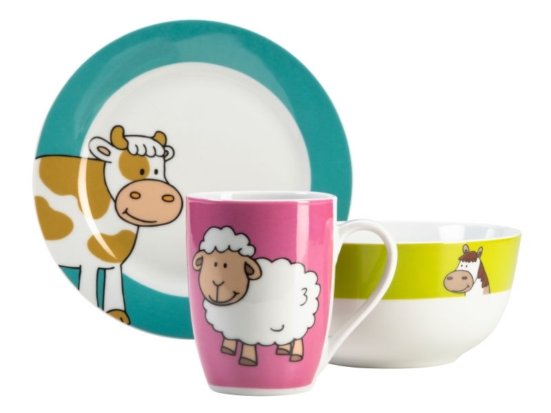 Dětská sada FARMA 3 díly - miska, hrneček a talířek. Materiál - porcelán. Rozměry - miska - výška 7 cm, průměr 14,5 cm, hrneček - objem 290 ml, výška 10 cm, průměr 7,5 cm, talíř - průměr 19 cm. prečítať celé