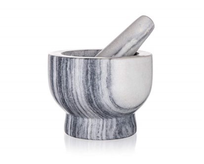 Hmoždíř mramorový CULINARIA s tloučkem pro klasické drcení koření, bylinek a výrobu domácího pesta. Hmoždíř si najde své místo v každé kuchyni jako užitečný pomocník i ozdoba. TIP: Je dobré nakupovat celé koření, jelikož mleté koření časem ztrácí chuť a vůni. Proto je dobré si potřebné množství vždy čerstvě rozmělnit například v hmoždíři. Délka tloučku je 13,7 cm.