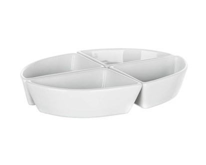 Servírovací sada oválná porcelánová BIANCA v bílé barvě, se skládá z oválného podnosu 19 x 13 cm a 4 mističek různého tvaru. Tato sada má široké využití. Podnos můžete využít na servírování jednohubek, chlebíčků, koláčů, dortů či mini dortíků. Do jednotlivých malých mističek můžete dát různé dipy, marmelády, sypání, oříšky, ovoce nebo zeleninu. Vhodné pro každodenní použití. Sada je vhodná do myčky na nádobí.