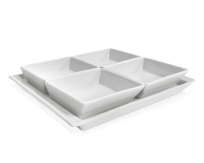 Servírovací porcelánová sada BIANCA v bílé barvě, se skládá z podnosu a 4 mističek. Rozměr tácu je 30 x 26 x 4 cm. Tato sada má široké využití. Podnos můžete využít na servírování jednohubek, chlebíčků, koláčů nebo mini dortíků. Do jednotlivých malých mističek můžete dát různé dipy, marmelády, sypání, oříšky, ovoce nebo zeleninu. Vhodné pro každodenní použití. Sada je vhodná do myčky na nádobí.