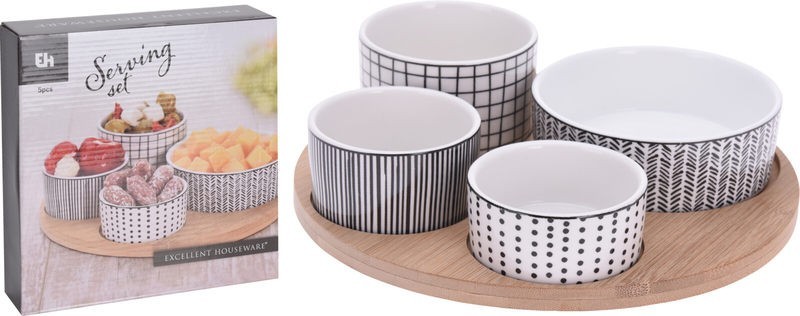 servírovací set vzorovaných misek a podnosu pro nejrůznější příležitostimateriál: bílý porcelán s lesklou glazuroupodnos z bambusového dřeva s připravenými otvory pro misky, mističky díky tomu drží na místěperfektní pro servírování předkrmů, pochutin, dipů a omáčekžáruvzdorné do 200 °C, misky lze...