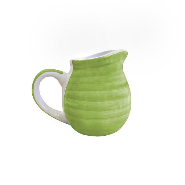 Mlékovka s výlevkou a ouškem. Je vhodná k servírování mléka ke kávě. Vyrobena z proužkované keramiky. Vhodná do myčky na nádobí. Objem 250 ml, rozměry 9 x 10 cm. Barva zelená. prečítať celé