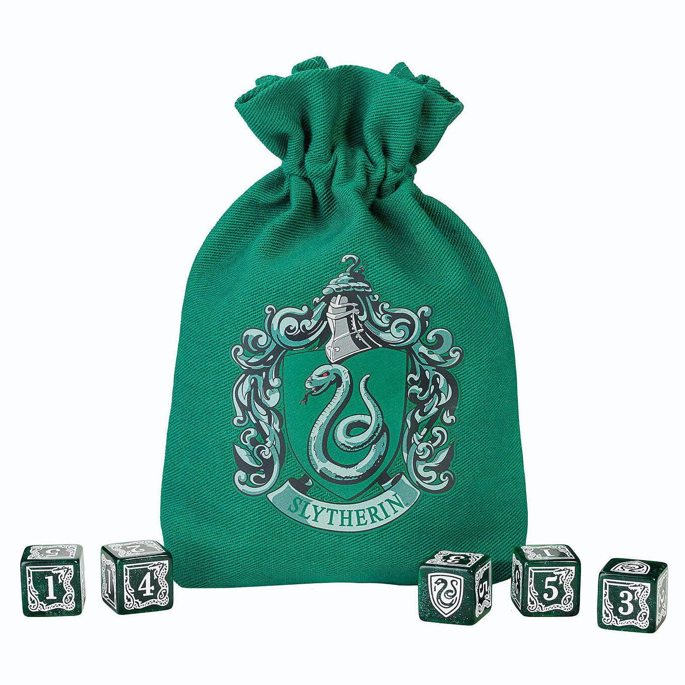 Sada obsahuje 5 šestistěnných kostek a váček v grafice a barvách bradavické koleje Zmijozel. Skvělý doplněk her na hrdiny a deskovek nejen ze světa Harry Pottera! prečítať celé
