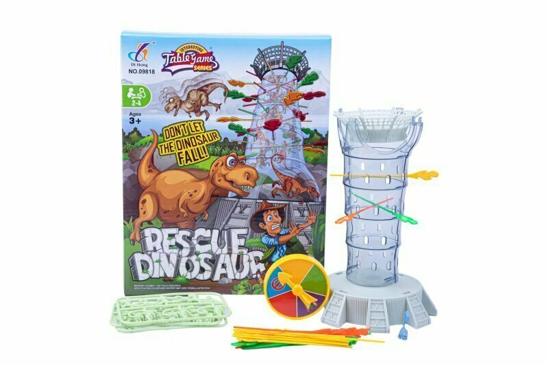 Gra spadające dinozaury. Nie pozwól spaść dinozaurom. Umieść patyczki w wieży dinozaurów. Wsyp dinozaury do środka. Zakręć strzałką i wyciągnij patyczek odpowiedniego koloru. Bądź ostrożny, nie pozwól dinozaurom spaść. Wieża wymaga montażu. W zestawie: elementy do budowy wueży, 21 patyczków w 3 kolorach, strzałka, 1 niebieski dinozaur, 18 niebieskich dinozaurów. Wymiary opakowania: 28,5 x 22 x 6,5 cmLiczba graczy: 2-4Wiek: 3+