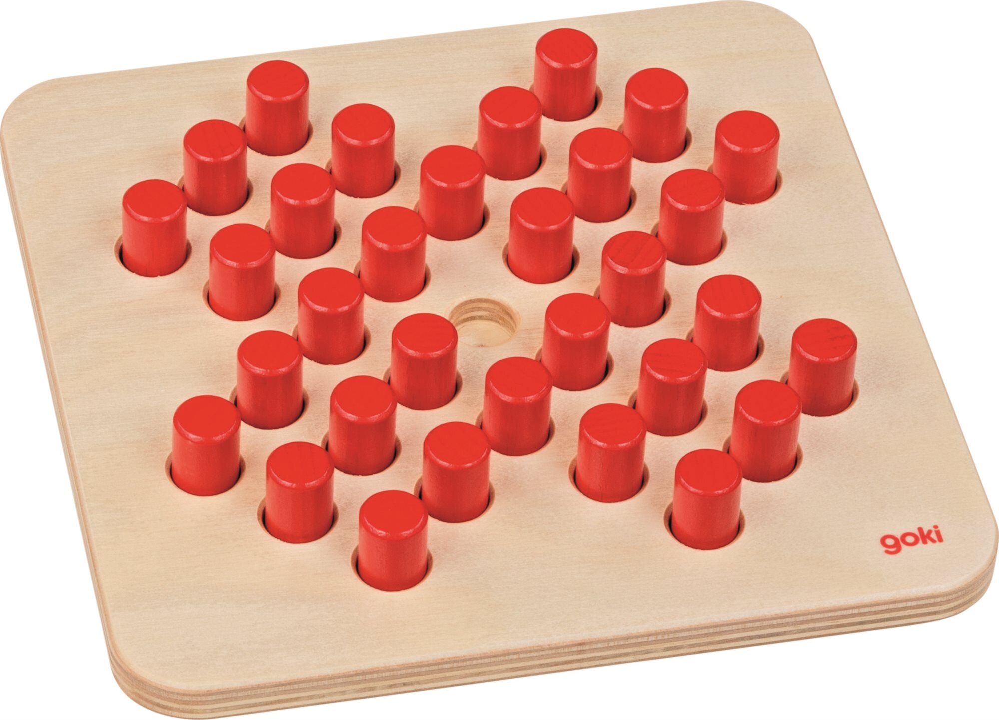 Klasická hra pro jednoho hráče v praktickém balení. Herní deska i dílky jsou vyrobeny ze dřeva. Princip hry: Vložte všechy kolíky do otvorů na desce, prostřední otvor zůstane prázdný. Poté začněte přeskakovat. Kterýkoliv kolík může přeskočit sousední kolík, pokud se za ním nachází prázdné...
