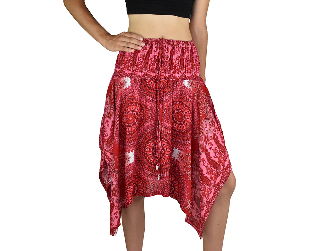 Lehká vzdušná sukně ideální pro letní dny. Má široký žabičkovaný pas, obdélníkový střih vytváří výrazné ozdobné cípy pro neotřelý vzhled. Délka je ke kolenům a díky šňůrkám můžete sukni snadno proměnit i ve stylový top.Rozměry:Pas: 25 - 45 cmDélka: 62 cmVelikost: S/M (odpovídá všem těmto...