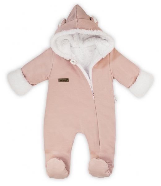 Oteplený kojenecký overal/kombinéza s kapucí, I Love You, pudrově růžová/bílá; 68 (3-6m)